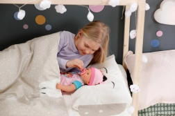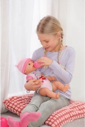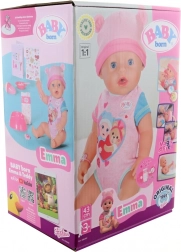 Emma este o păpușă BABY born adorabilă, cu funcții realiste pe care copiii le iubesc. Bea apă din biberon, la rotirea suzetei își deschide și își închide ochii, poate să verse lacrimi și să facă pipi în scutec sau la oliță. Datorită construcției rezistente, se descurcă și la baie, astfel încât copiii se vor distra pe săturate atât în cadă, cât și în afara ei.