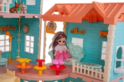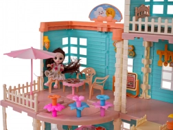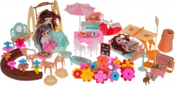 Setul include echipare completă, inclusiv 3 păpuși cu păr lung potrivite pentru pieptănat, mobilier și accesorii pentru exterior precum leagăn, umbrelă de soare și chiar masă de ping‑pong. Căsuța este realizată din plastic de calitate în culori vii, care atrag atenția la prima vedere.