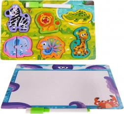 Tablă din lemn cu două fețe cu animăluțe pentru copii de la 3 ani, care îmbină desenul creativ și asamblarea distractivă a puzzle-urilor. Pe o parte servește ca tablă pentru marker lavabil, iar pe cealaltă ca suport cu motiv de junglă și decupaje pentru animale din lemn (zebră, leu, elefant, păun, girafă, crocodil). Realizarea de calitate din lemn, în culori vii, dezvoltă motricitatea fină, coordonarea mână–ochi și învățarea asocierii formelor.