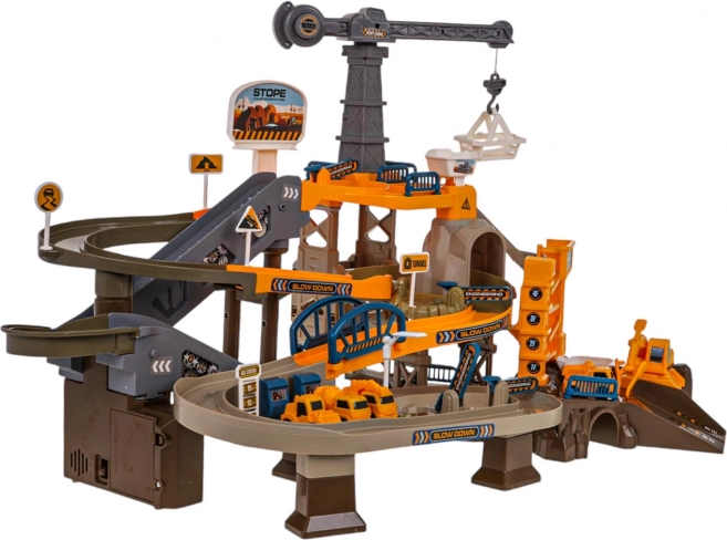 - piese structurale ale parcării, .- macara mobilă, .- 4 vehicule de construcții: basculantă, excavator, betonieră, buldozer, .- 12 imitații de pietre, .- 4 indicatoare rutiere, .- 2 pompe de combustibil, .- autocolante decorative, .- manual, . |
