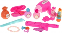 Include uscător de păr, placă de întins părul, trusă cosmetică, pieptene, parfum, lacuri, rujuri, ineluțe, clame, brățară și autocolante – totul pentru o transformare completă.