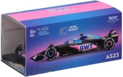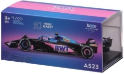 Culorile emblematice ale echipei: albastru, roz și negru, logotipuri fidele ale sponsorilor BWT, ALPINE și Castrol și forme aerodinamice – acest model oferă un aspect realist al monopostului Alpine A523 (sezon 2023). La scara 1:43 arată excelent în orice vitrină.