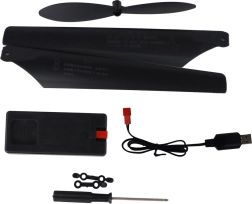 - Elicopter RC, telecomandă, încărcător USB, elice de rezervă, șurubelniță, manual de utilizare, ambalaj original