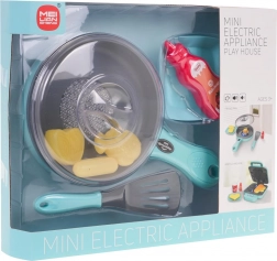 În pachet găsești o tigaie cu capac transparent, o spatulă, o farfurioară, o sticluță de „ketchup” și alimente (pește, friptură, cârnați) – totul pregătit pentru un ospăț imaginar.