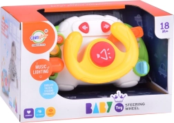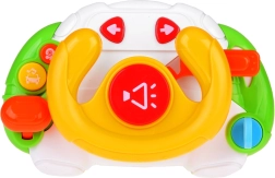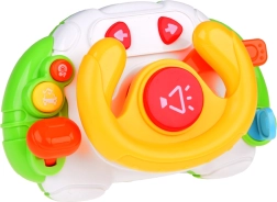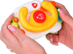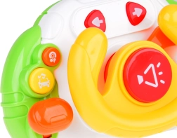 Volanul este proiectat să încapă ușor în cărucior sau în geanta de călătorie. Datorită butoanelor intuitive, copiii învață rapid controlul: butonul roșu pentru claxon, galben pentru melodii (3 tipuri) și albastru pentru sunete și muzică (4 tipuri). În timpul redării muzicii, centrul volanului se luminează ritmic.