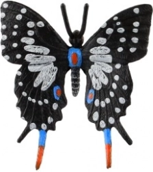 Acest model de fluture de calitate surprinde trăsăturile tipice ale genului Papilio – aripi elegante negre cu pete albe și accente fine albastre și roșii. Datorită realizării realiste, este un accesoriu excelent pentru iubitorii naturii, școli și muzee.