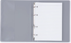 Caiet cu inele stilat, format A4, în eleganta culoare gri, cu coperți rezistente din PVC și mecanism cu 4 inele. Include 100 de file dictando, ideal pentru școală, birou și organizarea notițelor acasă.