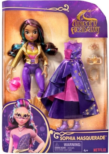 Prezentăm păpușa Sophia Masquerade din seria populară Academia Unicornilor. Această păpușă de 23 cm este inspirată de Netflix și cărțile populare, aducând magia și creativitatea în casa ta. Sophia este detaliat prelucrată și vine cu 9 accesorii la modă incluzând o jachetă detașabilă, colier și pantofi, care pot fi ușor schimbate cu o rochie asimetrică, curea, mască și pantofi violet.