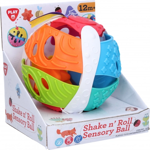 Mingea de sortare Playgo, cu diametrul de 15 cm, oferă copiilor de la 12 luni o mulțime de distracție senzorială. Include 2 mingiuțe moi, care se introduc în minge, și o panglică cu rotiță rotativă, care la învârtire produce un sunet de clic.