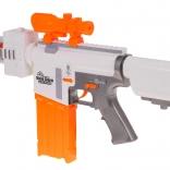 Blasterul este realizat din plastic de calitate și se potrivește excelent în mână. Raza de tragere este de aproximativ 15 metri, ideală pentru bătălii acasă și în aer liber. Alimentarea este asigurată de 5× AA 1,5 V baterii (nu sunt incluse în pachet).
