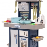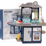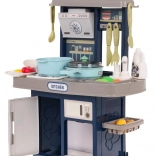 Bucătăria stilată pentru copii, în culoare albastră, oferă efecte luminoase și sonore, apă curgătoare la robinet și un set bogat de 35 de accesorii pentru gătit realist. Construcția solidă, plita interactivă cu iluminare și sunete de prăjire sau fierbere, precum și cuptorul și frigiderul cu uși care se deschid stimulează jocul creativ și dezvoltarea imaginației copiilor de la 3 ani în sus.