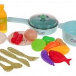 Oală, tigaie, farfurii, tacâmuri și o gamă variată de accesorii alimentare oferă copiilor tot ce au nevoie pentru a se juca de-a bucătarul.