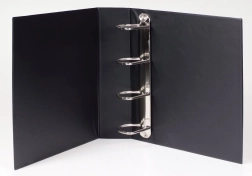 Dosar de calitate pentru cataloage în format A4, într-o culoare neagră elegantă, echipat cu un buzunar transparent pe partea din față și pe cotor. Datorită mecanismului cu 4 inele, facilitează organizarea documentelor.