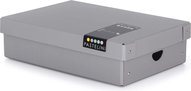 Practică cutie de depozitare laminată PASTELINI în culoare gri elegantă, cu capac stabil și decupaje pentru mânere pentru manipulare ușoară. Datorită dimensiunilor compacte 355 × 240 × 95 mm și greutății reduse de 0,41 kg, păstrează în siguranță documente, jucării și alte mărunțișuri acasă sau la birou.