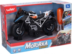 Această motocicletă albă de înșurubat, cu lungimea de 20 cm, este o jucărie excelentă pentru dezvoltarea motricității fine și a gândirii tehnice. Copiii o pot dezasambla și reasambla singuri cu ajutorul șurubelniței și cheii incluse. Prin apăsarea părții din spate a motocicletei se pornesc efectele luminoase și sonore, care fac jocul și mai captivant.