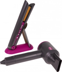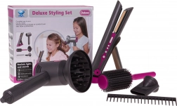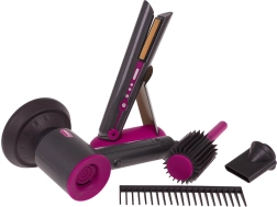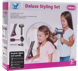 Setul de coafură ideal pentru copii care doresc să devină mici stiliste. Set bogat echipat include un uscător cu accesorii interschimbabile, placă de păr, pieptene și perie. Uscătorul este alimentat de două baterii de tip AA (nu sunt incluse) și emite sunete ca la uscarea reală. Placa de păr luminează și emite sunete tipice la pornire.