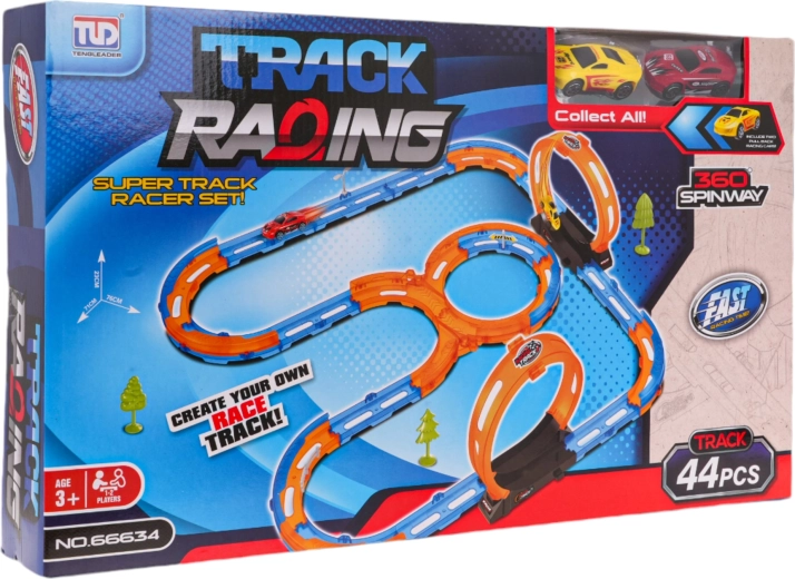 Setul include 44 de piese pentru o asamblare ușoară și clară a propriei piste de curse.