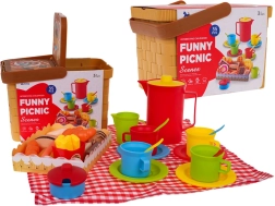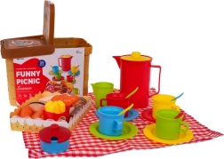 Conținutul setului: coș cu mâner, pătură de picnic, tavă din carton, ceainic mare și unul mic, cu cioc, 4 farfurașe, 4 pahare, 4 lingurițe, oală cu capac, coș cu bunătăți (croissant, 7 biscuiți, ciocolată, vaflă, hot dog, cartofi prăjiți și ketchup).