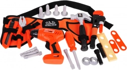 - Centură reglabilă pentru unelte; bormașină; 3 biți interschimbabili pentru bormașină; adaptor pentru șurubelniță; 2 biți interschimbabili pentru șurubelniță; clește; cheie reglabilă; cuțit; ciocan; 2 piese pentru înșurubat; 1 piesă „din lemn”; 2 șuruburi; 2 capete; 4 dibluri