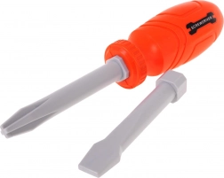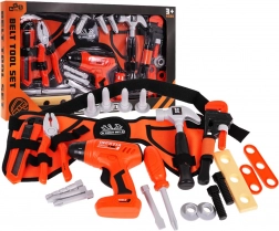 Ciocan, clește, cheie reglabilă, cuțit, șurubelniță cu adaptoare, șuruburi, dibluri și piese pentru înșurubat – ideal pentru antrenarea motricității fine și a jocului de rol.