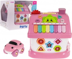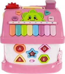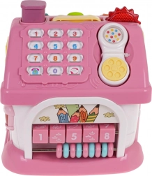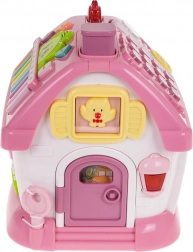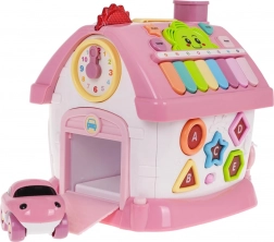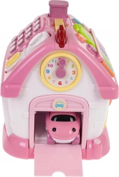 Acoperișul ascunde un telefon detașabil, o tastatură numerică și un pian cu opt clape colorate pe care copiii pot cânta melodii, schimbând tonuri și ritmuri. Partea frontală a căsuței oferă uși care se deschid, cu sunet de sonerie și luminiță, iar pereții laterali includ alfabetul A–E cu pronunție în engleză și denumiri ale formelor, elemente rotative și un garaj cu mașinuță roz retractabilă.
