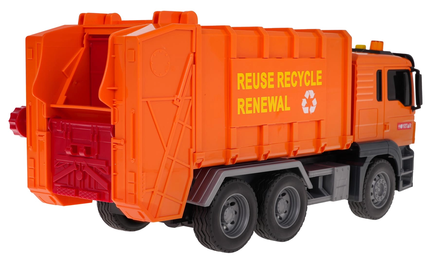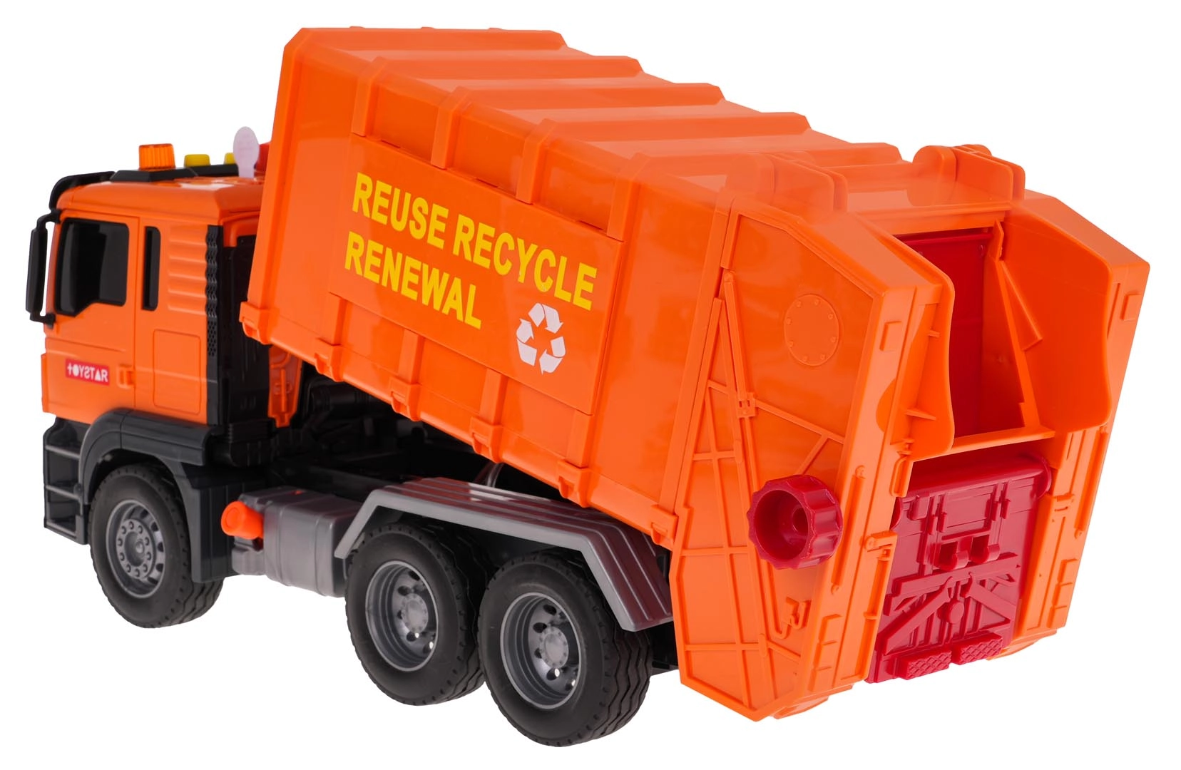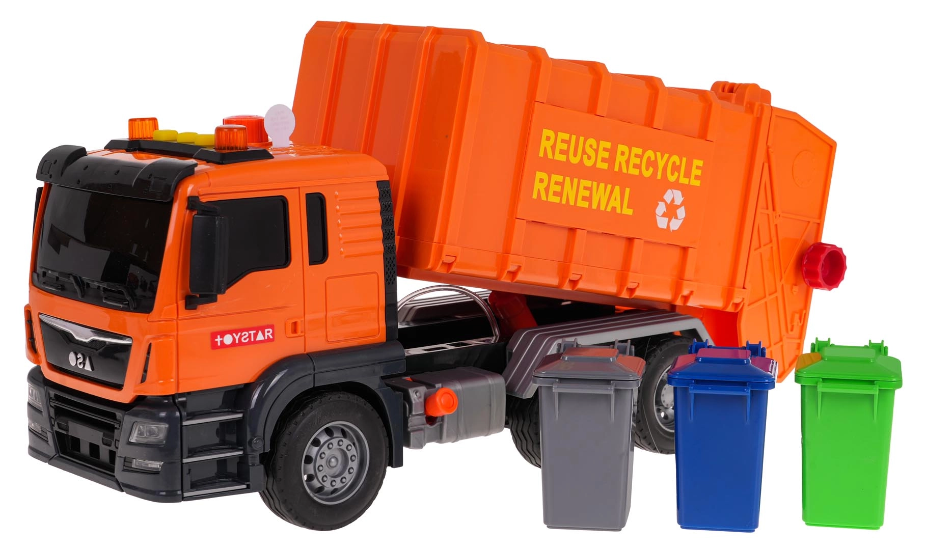 | Traducere din limba engleză.. | Mașină de gunoi portocalie cu funcție sonoră + accesorii . |