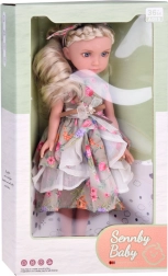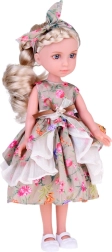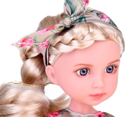 Această păpușă fermecătoare este alegerea perfectă pentru orice mică iubitoare de modă. Cu păr blond lung, împletit într-o coadă elegantă, este îmbrăcată într-o rochie florală elegantă, decorată cu volane, completată de o bentiță cu flori și pantofiori albi. Stilul general este pur și simplu uimitor!