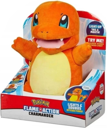 Descoperiți lumea magică a Pokémonilor cu acest Charmander de pluș, care oferă experiențe interactive prin efectele sale de lumină și sunet: