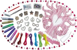 Acest set complet de artă este ideal pentru micile cochete și toți copiii care iubesc să creeze și să poarte propriile bijuterii. În pachet găsești tot ce ai nevoie – de la pandantive metalice și șnururi sintetice, la pietricele, sclipici, lipici și un practic „arbore de bijuterii” din carton pentru expunerea creațiilor finalizate.