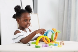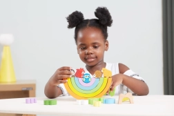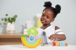 Această construcție Montessori îmbină plăcerea de a asambla curcubeul cu fantezia jocului cu animăluțe drăgălașe. Copiii pot suprapune arcurile colorate, crea tuneluri și poduri, construi adăposturi pentru animăluțe și explora cum funcționează balansarea și stabilitatea. Jocul dezvoltă natural motricitatea fină, percepția senzorială și creativitatea.