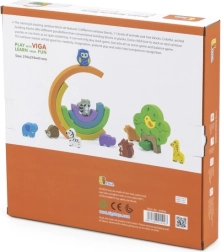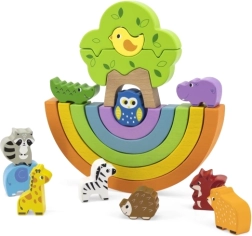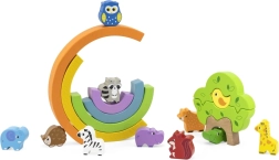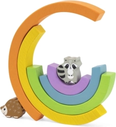 Curcubeul din lemn colorat, cu 11 animăluțe și un copăcel de la Viga, oferă posibilități nesfârșite de joacă creativă. Copiii își antrenează echilibrul și coordonarea, construiesc căsuțe și obstacole, învață culorile și ordinea. Piesele netede din lemn de calitate sunt sigure, fără muchii ascuțite și finisate cu vopsele netoxice.
