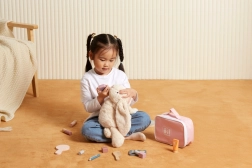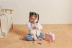 Oferiți-i micii stiliste propriul colțișor de frumusețe. Trusa textilă stilată păstrează toate accesoriile „cosmetice” din lemn la un loc și permite să le ia oriunde cu ea. Joaca susține motricitatea fină, imaginația și dezvoltarea abilităților sociale în jocurile de rol.