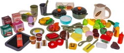 Oală, tigaie, tacâmuri, farfurii, alimente cu scai, băuturi, condimente, tablă cu cretă și autocolante – totul pentru gătit creativ.