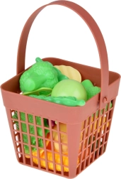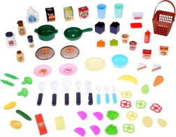 Bucătăria include o varietate de vase, oale, ustensile și alimente de jucărie, inclusiv coș pentru legume și recipiente pentru sortare.