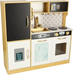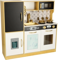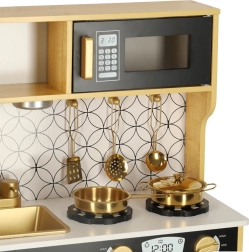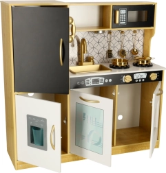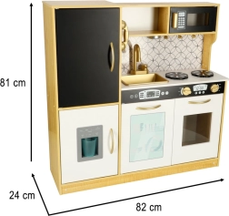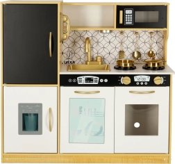 Bucătăria din lemn marca LULILO este un excelent instrument educațional, care sprijină dezvoltarea imaginației și abilităților manuale ale copiilor. Bucătăria este echipată cu multe aparate funcționale, cum ar fi frigider cu dozator de gheață, cuptor, mașină de spălat vase și cuptor cu microunde, ceea ce o face un loc preferat pentru joacă și pentru organizarea de petreceri cu păpuși sau părinți. Datorită iluminării eficiente, creează o atmosferă autentică.