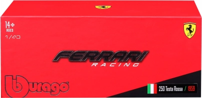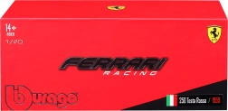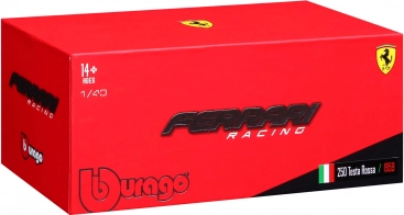 Cutie atrăgătoare cu logo-urile FERRARI și BBURAGO care protejează modelul și este potrivită atât pentru expunere, cât și pentru a fi oferită cadou.