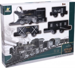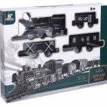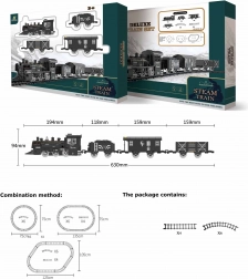 Setul conține o locomotivă (20 cm), trei vagoane (10–15 cm), șine drepte și curbe și un recipient pentru apă pentru a crea un efect de fum realist. Alimentarea este asigurată de 4 baterii AA (nu sunt incluse). Comutatorul ON/OFF este amplasat pe partea stângă a locomotivei, iar rezervorul de apă se află sub coșul de fum argintiu.