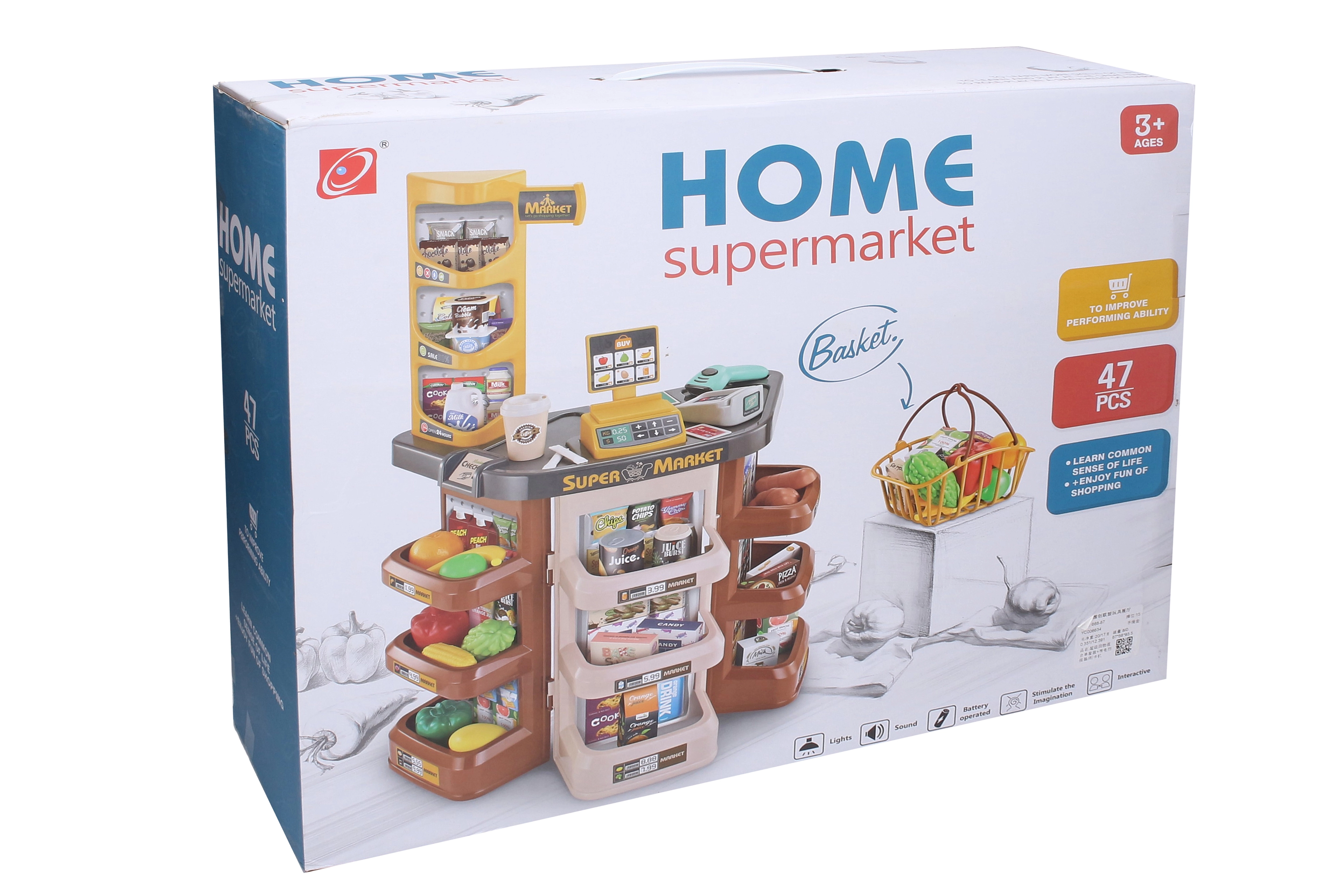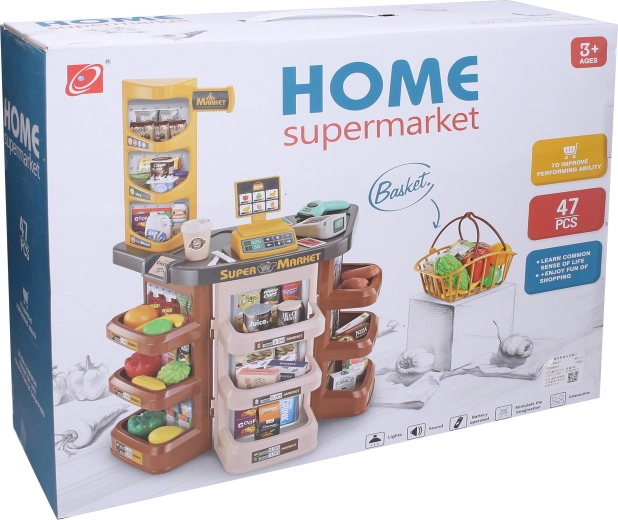 Setul include supermarketul cu tejghea, casă de marcat, scanner de coduri de bare, terminal de plată și card de plată. Nu lipsesc bancnotele, monedele, coșul de cumpărături și o selecție variată de alimente precum fructe, legume, lapte, cafea, suc, biscuiți, pizza sau nuci. Pe partea inferioară a ambalajului găsiți un ghid ilustrat pentru asamblare ușoară.