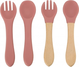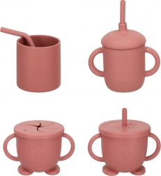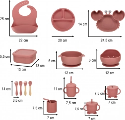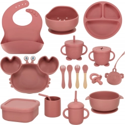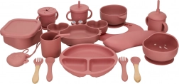 Set complet de veselă din silicon pentru copii în culoarea roz închis, include farfurii, boluri, cești și tacâmuri. Vesela este fabricată din silicon sigur, ușor de curățat și este ideală pentru a învăța să mănânce independent.