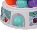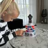 Ce găsiți în pachet: bază solidă cu evacuare pentru biluțe și 2 autocolante, 36 de biluțe în 4 culori (albastru deschis, albastru, portocaliu, mov), 3 inele pentru construirea turnului, o ruletă și 2 bețișoare pentru extragerea biluțelor.