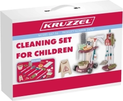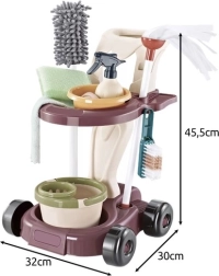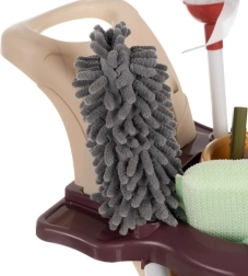 Cărucior cu mâner ergonomic - căruciorul pe patru roți late, fabricat din plastic PP de înaltă calitate, a fost conceput pentru manevrare ușoară. Mânerul ergonomic, lat îi ajută pe copii să conducă căruciorul chiar și în timpul jocului în mișcare. Pe două rafturise pot așeza diverse elemente ale setului: găleata cu sita pentru mop pe raftul de jos, iar bolul, suportul, storcătorul și săpuniera pe raftul de sus. Datorită orificiilor speciale, în cărucior se pot fixa pămătuful rotund pentru șters praful, buretele și mopul, permițând acces facil la toate instrumentele. Pe lateralele căruciorului există două cârlige pentru agățarea lavetei din microfibră.