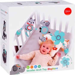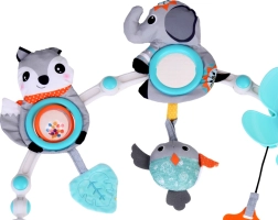 Elefant cu elemente foșnitoare și oglindă, o pasăre ca element interesant pentru bebeluși și o floare-morărit care poate fi mișcată trăgând de steaua portocalie.