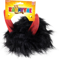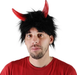 Perucă de carnaval cu stil, în tematica diavolului, pentru adolescenți și adulți. Oferă păr negru cu breton scurt și coarne roșii accentuate, datorită cărora vei crea cu ușurință un costum de diavol autentic pentru bal mascat, Moș Nicolae sau petreceri tematice.