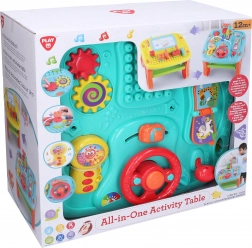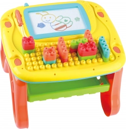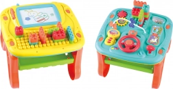 Măsuța de activități cu două fețe pentru copii oferă două suprafețe de joacă într-una singură: pe partea superioară găsiți volan, schimbător de viteze și zornăitoare, iar pe partea inferioară o tablă magnetică de desen și o bază pentru construit cu cuburi. În pachet sunt incluse cuburi, melodii și baterii, astfel încât este gata de utilizare imediat. Dimensiunea compactă de 37 cm se potrivește în orice cameră pentru copii.