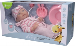 Un bebeluș adorabil în salopetă moale roz va bucura orice mică mămică. Păpușa cu dimensiunea de 40 cm este ideală pentru joacă și îngrijire și vine cu accesorii practice: oliță, bol, tacâmuri și suzetă pentru o experiență de joc mai realistă.