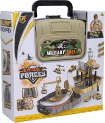 Set de aventură pentru micii pasionați de armată: stație militară cu pistă, lift, macara, heliport și 2 mașini într-un rucsac practic cu bretele. Ideală pentru acasă și în deplasare, cu instrucțiuni ilustrate pentru asamblare ușoară.