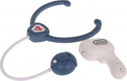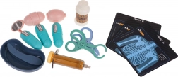 Stetoscop cu sunetul inimii, termometru cu lumină, seringă, foarfecă, pensetă, sticluță, picurător, instrumente stomatologice și alte accesorii pentru joacă creativă.