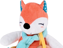 Vulpița este realizată în culori liniștitoare, combinând portocaliul cu detalii albe și turcoaz, ceea ce contribuie la stimularea vizuală a bebelușului.
