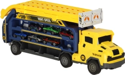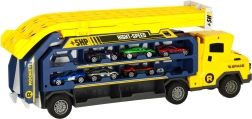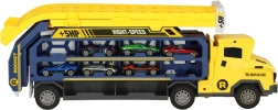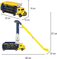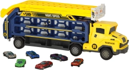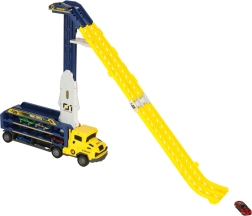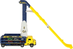 Acest transportator de mașini multifuncțional se transformă în câteva clipe într-o pistă de curse cu două benzi impresionantă. Copiii pot transporta până la șase mașinuțe și apoi le pot lansa pe traseele paralele pentru curse pline de adrenalină. Designul atrăgător galben–albastru invită la joacă și sprijină motricitatea fină și coordonarea mână–ochi.