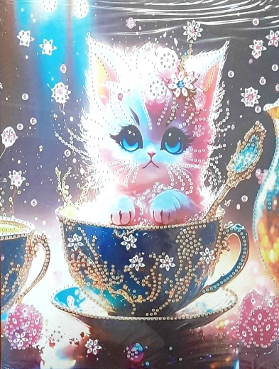 Creează-ți propriul tablou sclipitor cu un adorabil pisoiaș într-o ceașcă și bucură-te de creație relaxantă pentru copii și adulți. Setul conține tot ce ai nevoie – pânză cu cadru solid, pietricele colorate, stilou de aplicare, tăviță și ceară. Pictura cu diamante este simplă și nu necesită abilități artistice, fiind ideală ca cadou creativ și activitate distractivă pentru întreaga familie.